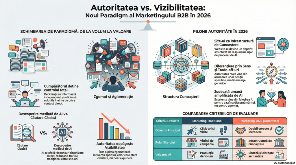In marketingul B2B din 2026, autoritatea in domeniu nu mai este un avantaj competitiv optional. Este o conditie de baza pentru a exista in procesul decizional. Calatoriile de cumparare conduse de clienti nu mai sunt un fenomen emergent, ci realitatea operationala.